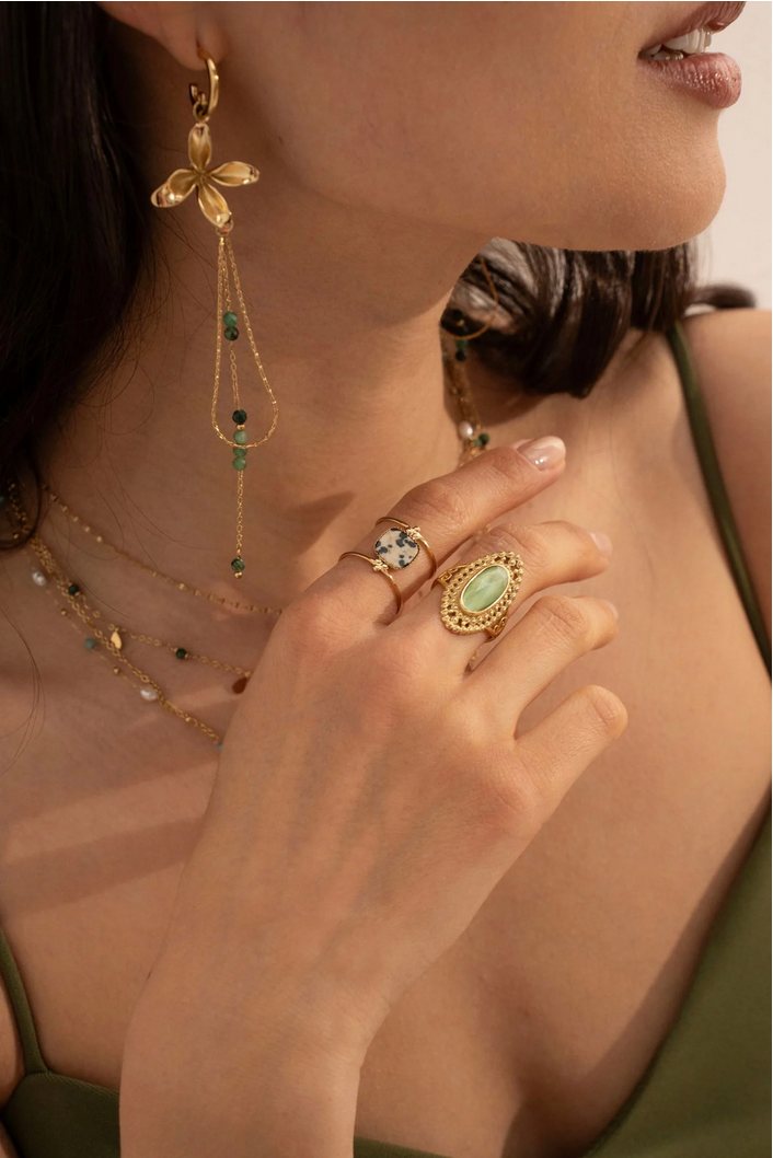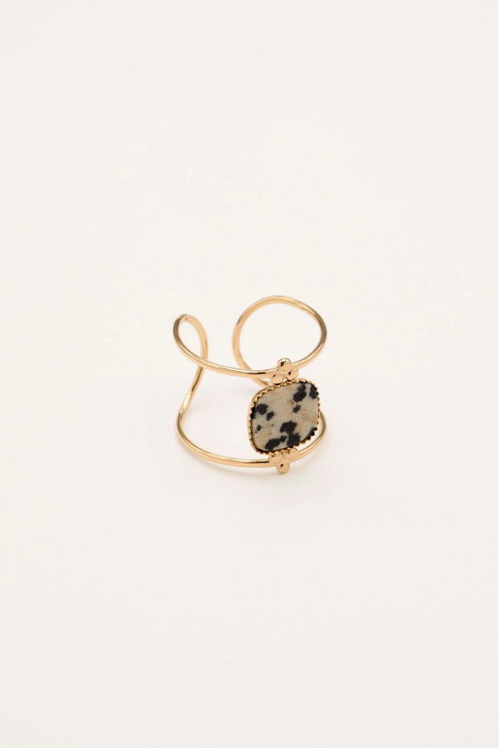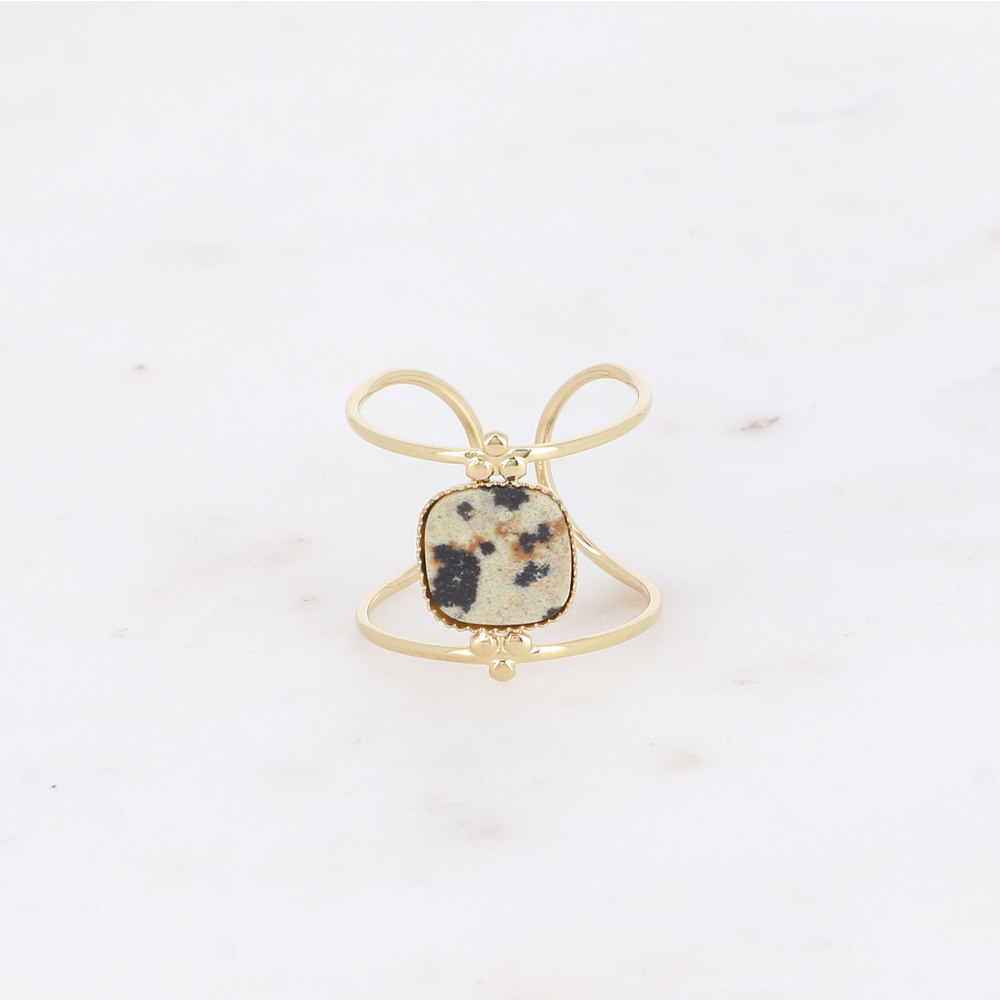 Bague large en acier inoxydable composée de 2 anneaux fins embellies par une pierre naturelle carrée.