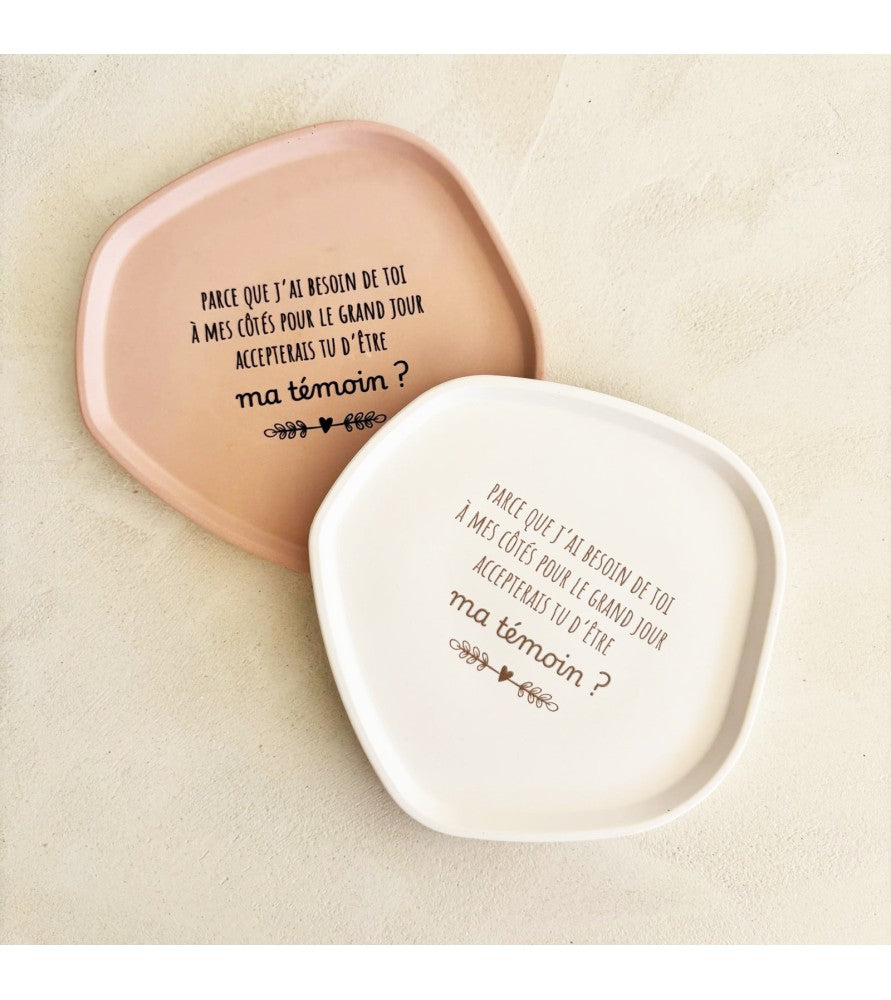 Ces coupelles en résine naturelle à base de sulfate de calcium sont de véritables petites merveilles à offrir lors des préparatifs de mariage. Avec leur message empreint de tendresse, elles permettent de formuler une demande symbolique et inoubliable à une amie précieuse :