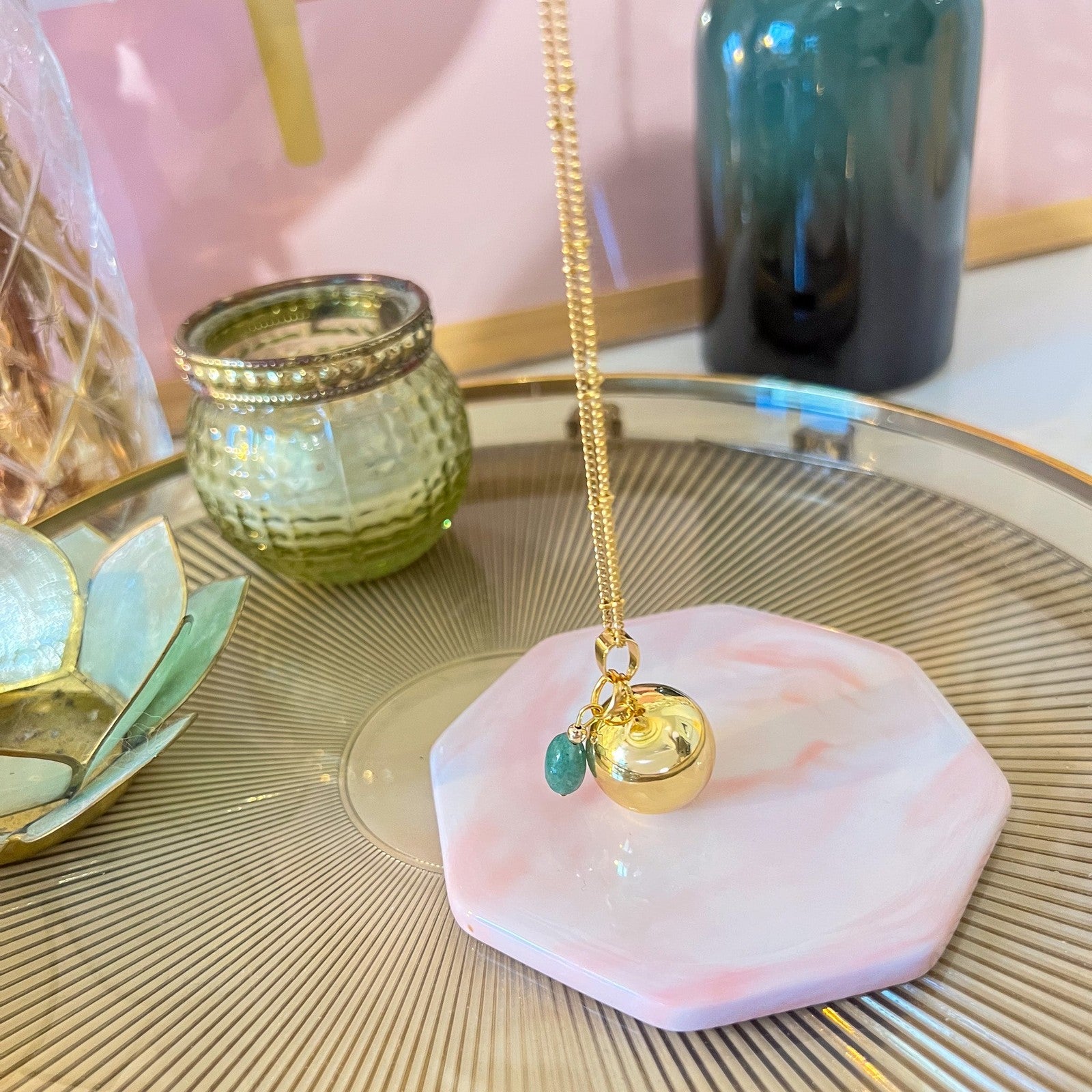 Le Bola de grossesse or avec pierre naturelle au choix est un collier symbole de maternité, conçu pour accompagner avec douceur chaque future maman tout au long de sa grossesse. Ce bijou artisanal en plaqué or 18 k mêle élégance bohème, esthétique raffinée et sens profond, créant un lien précieux entre vous et votre bébé.