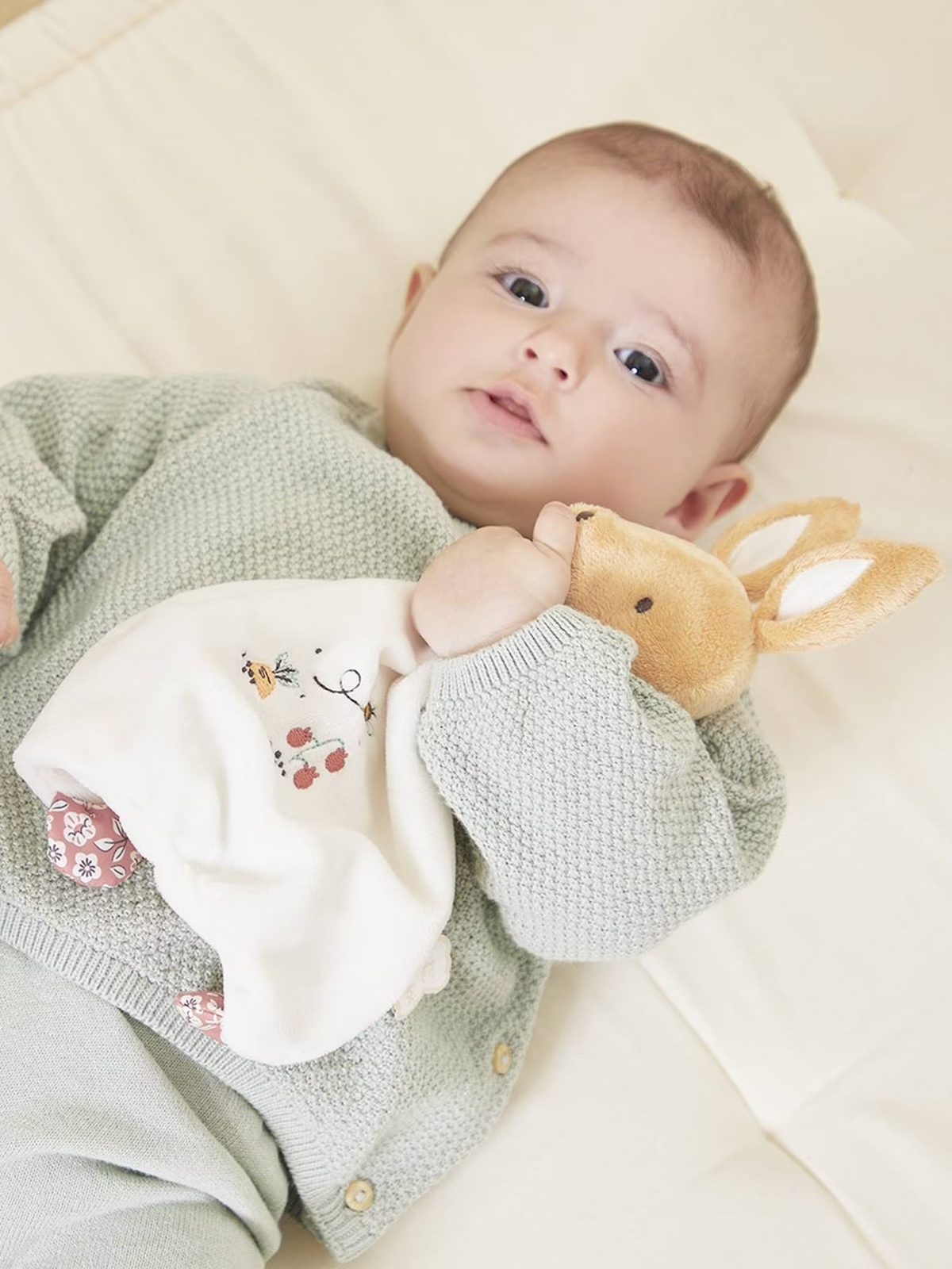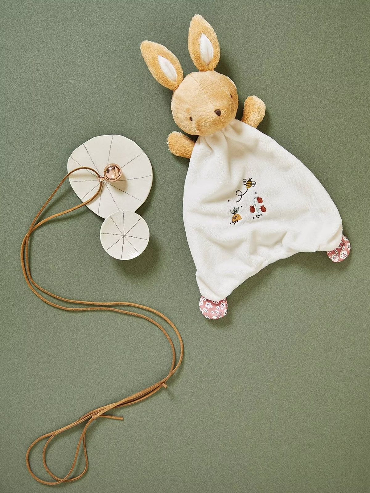 Le doudou lapin mesure 24 cm et est décoré de délicates broderies inspirées de la comptine « Mon petit lapin ». Fabriqué à partir de 76 % de matières recyclées, rembourrage inclus, il allie douceur, sécurité et engagement responsable. Il est lavable en machine à 30 °C.