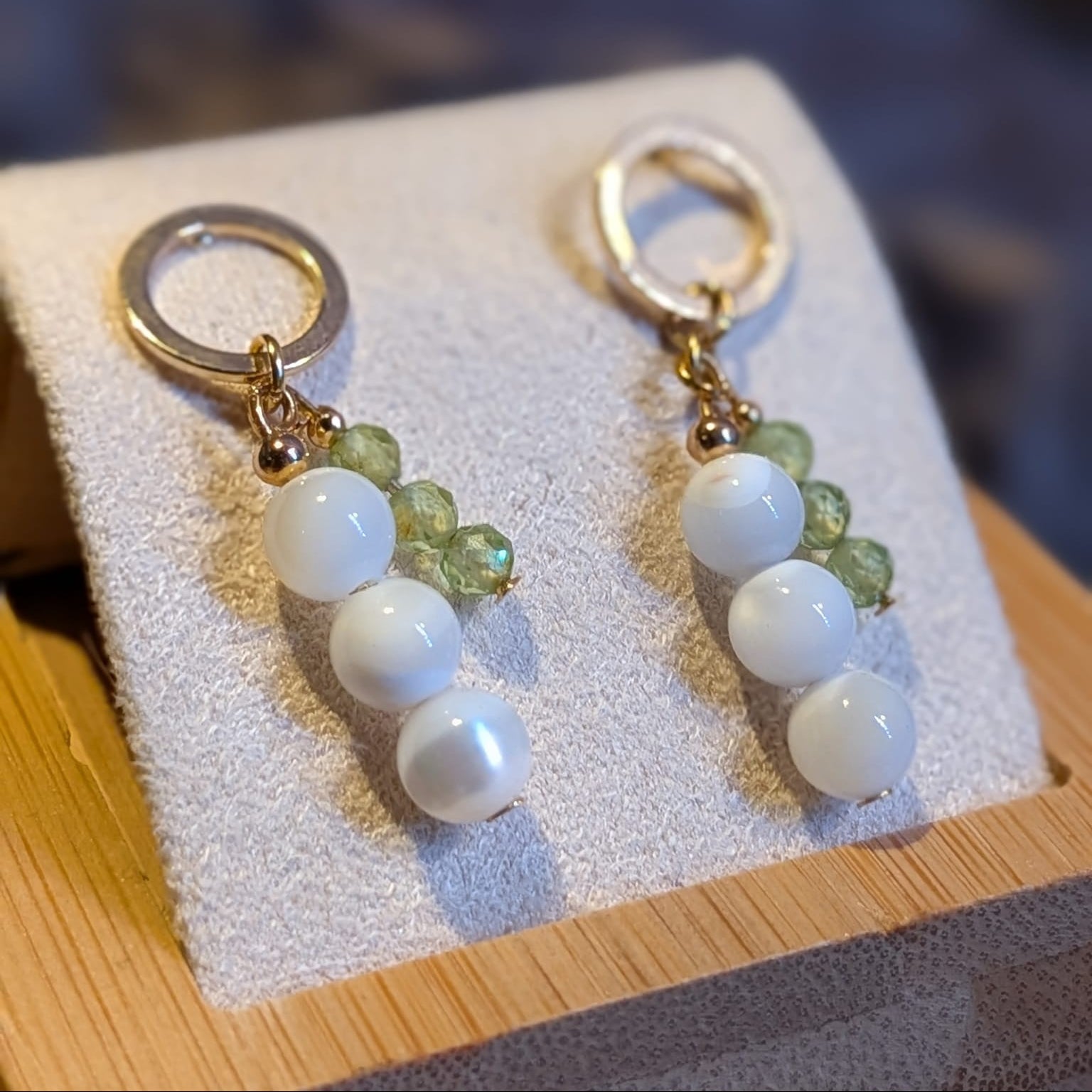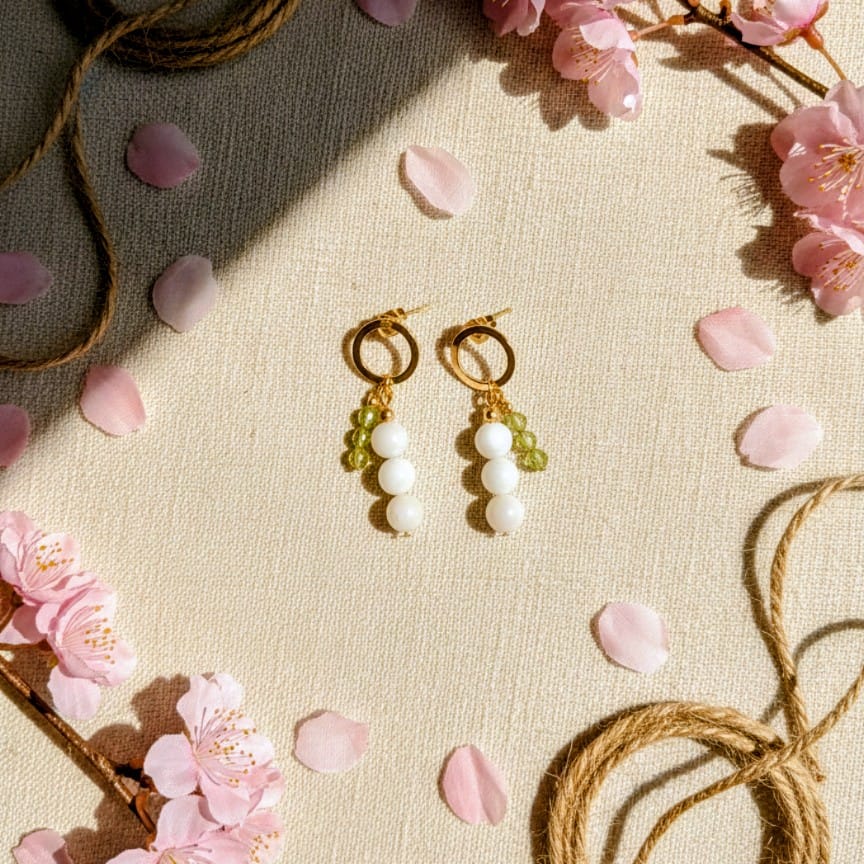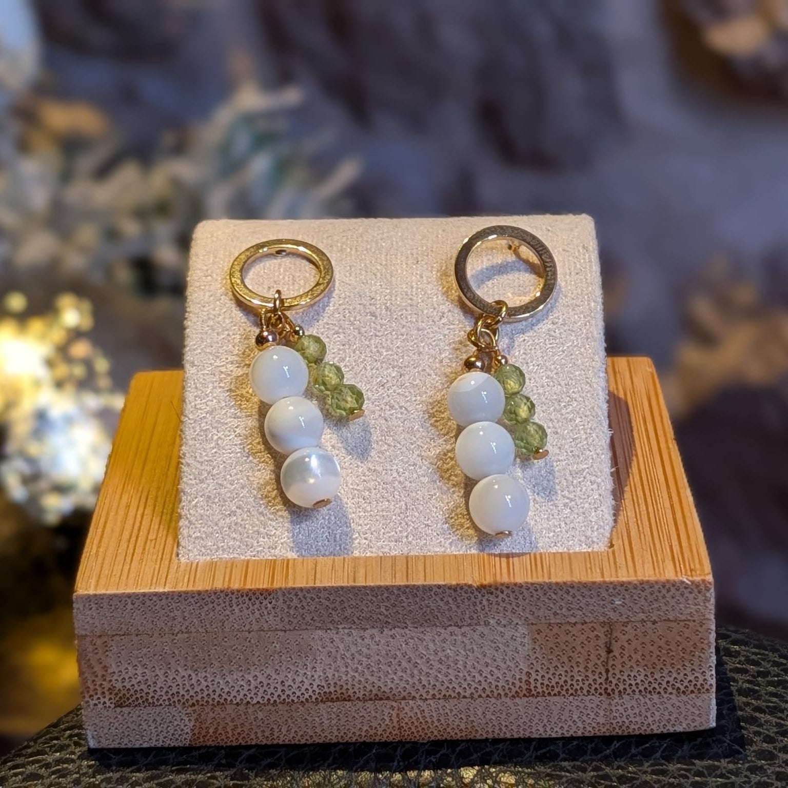 Chaque boucle est ornée d'un pendentif composé de trois perles de nacre lumineuses et de trois perles de naissance facettées. Un mariage raffiné de matières, parfait pour célébrer un moment de vie (anniversaire, naissance, fête) ou pour offrir un cadeau riche de sens.
