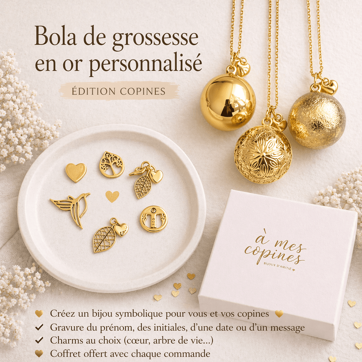 ✔ Charms au choix (cœur, arbre de vie, colibri, empreintes, etc.)
