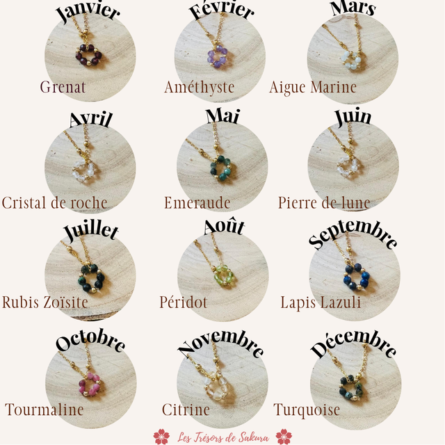 Janv. Grenat | Fév. Améthyste | Mars Aigue-marine | Avril Cristal | Mai Émeraude | Juin Pierre de lune | Juil. Rubis | Août Péridot | Sept. Lapis-lazuli | Oct. Tourmaline | Nov. Citrine | Déc. Turquoise